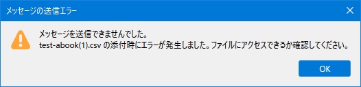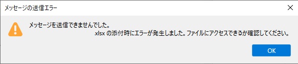 「メッセージを送信できませんでした。○○(添付ファイル名が入ります)の添付時にエラーが発生しました。ファイルにアクセスできるか確認してください」