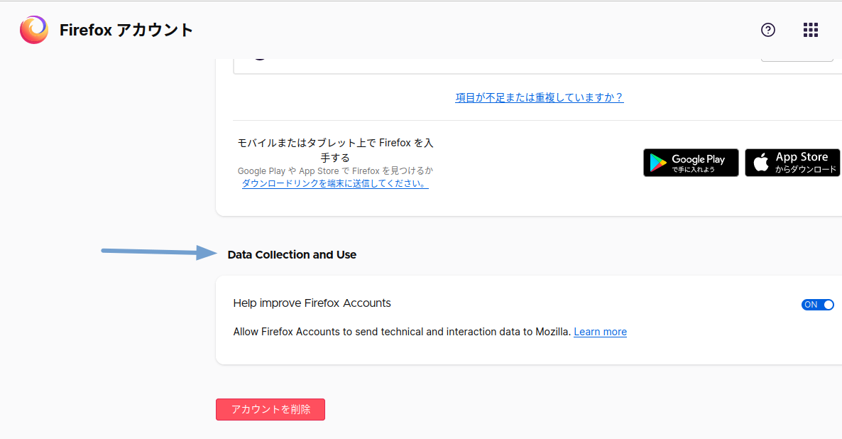 Firefox アカウントの管理画面に、データ協力オンオフ項目を新たに発見。