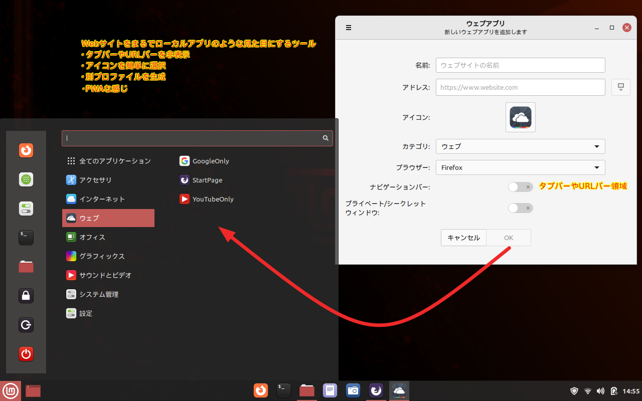 「ウェブアプリ」はMint製なのでUbuntu標準リポジトリ側にはアップされていないようなのです。