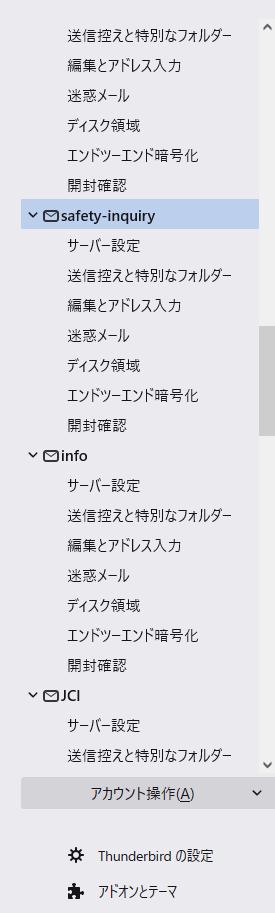 yahooメールは「ローカルフォルダ」に入りますが、それ以外はすべてそれぞれのフォルダが作られます。昔は2つのアドレスはすべてローカルに入っていたと思うのですが、今は数多いアカウントがあるせいでそれぞれ独立した状態になるのでしょうか?それぞれに送受信フォルダや自身が振分け用に作ったフォルダがある(添付画像では折りたたんでいます)せいで、かなりスクロールしないといけないのでちょっと不便です。
