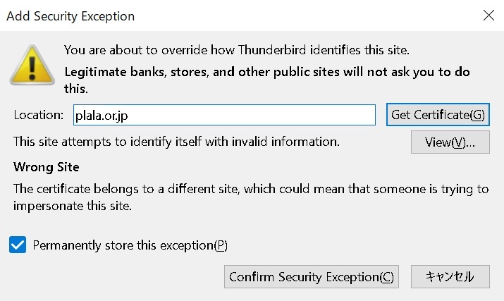 別のメーラー(Sylpheed)からThunderbirdに変えようとメール設定をしたところ、添付ファイルの画面(セキュリティ例外の追加)されました。