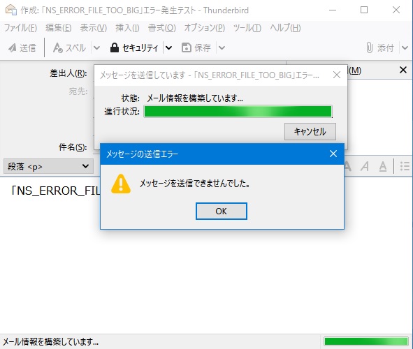 Exception { name: "NS_ERROR_FILE_TOO_BIG", message: "Component returned failure code: 0x8052000f (NS_ERROR_FILE_TOO_BIG) [nsIFile.createUnique]", result: 2152857615, filename: "resource:///modules/MimeMessage.jsm", lineNumber: 72, columnNumber: 0, data: null, stack: "createMessageFile@resource:///modules/MimeMessage.jsm:72:10\ncreateAndSendMessage@resource:///modules/MessageSend.jsm:128:41\nCompleteGenericSendMessage@chrome://messenger/content/messengercompose/MsgComposeCommands.js:6108:23\nGenericSendMessage@chrome://messenger/content/messengercompose/MsgComposeCommands.js:6024:11\n", location: XPCWrappedNative_NoHelper }