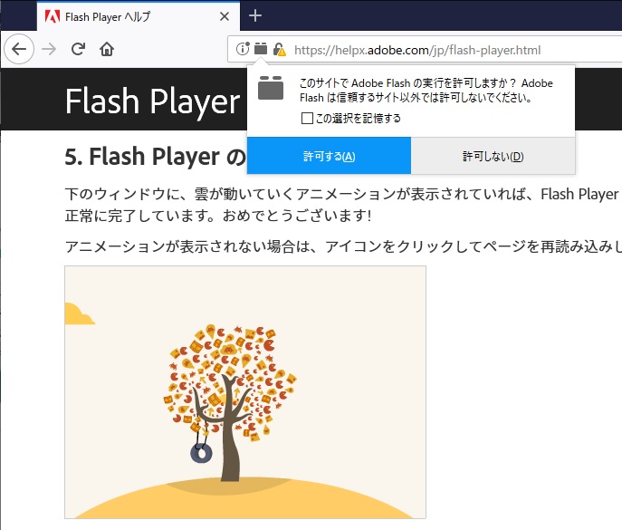 このページの「5. Flash Player の動作を確認します」にある Flash コンテンツで、許可設定が記憶されるかどうかの動作を試してみてください。